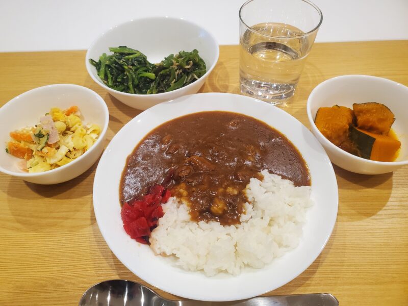 内定式終了後は、「第六回 社員食堂」が開催され、社長が心を込めて調理した特製昼食が振る舞われました。今回のメニューは、じっくり煮込んだ 牛すじカレーをメインに、かぼちゃの煮つけ、ほうれん草の胡麻和え、ピーマンのこんぶじゃこあえ、マカロニサラダという温かみのある副菜が並ぶ、栄養バランスの良い家庭料理風のラインナップとなりました。
